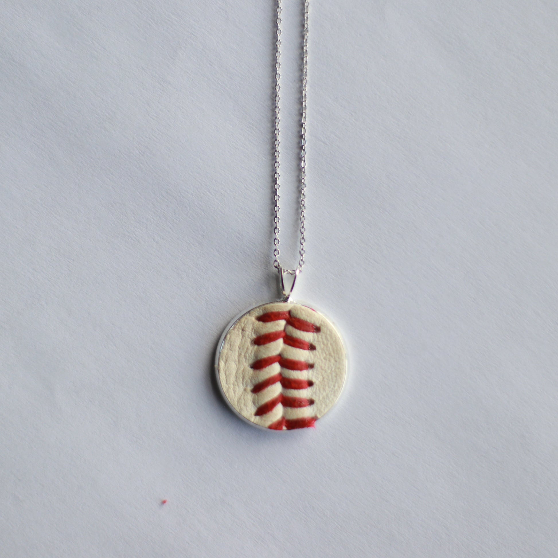 Your Baseball Seam Pendant necklace is made by hand from a baseball that started its life on a little league, high school, or college baseball field somewhere in the United States.